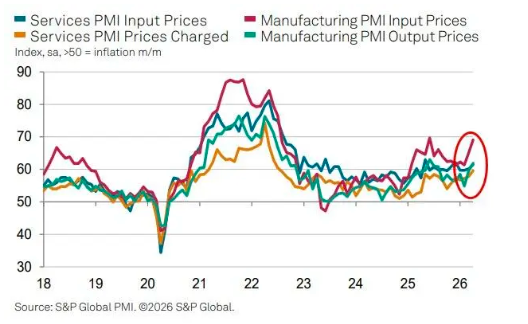 与此同时,美国4月制造业PMI初值录得54.0,高于前值的52.3,创47个月新高,但这一涨幅部分反映了企业为抢购可能因与伊朗的战争而短缺的物资所做的努力,更多源于预防性囤货,而非终端需求的实质性改善。